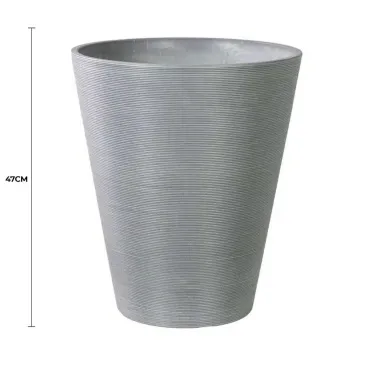 This tapered grey planter is made from exceptionally high-quality recycled materials that exceed the performance of most traditional pots and planters. The environmentally friendly round planter is the perfect choice for anybody wanting a low-maintenance planter for either indoors or outdoors that will last for years. Finished with a simply stunning textured lined surface youll absolutely love this super planter. There is a hole with a plug in the base to allow for drainage should you require.