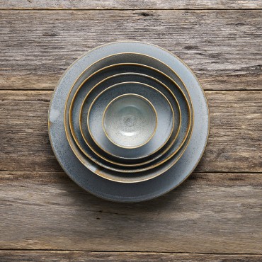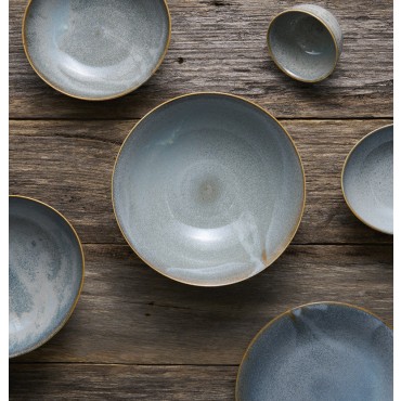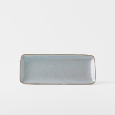 The Steel Grey glaze features a soft, powdery blue tone with a smooth, semi-gloss finish. Subtle speckling and tonal variation throughout the surface add depth, while the edges are gently framed with a natural, earthy brown outline