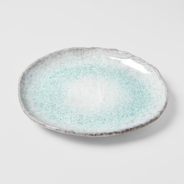 This plate is a fine example of Minoyaki ceramics, a tradition celebrated for its innovation and artistry. Each plate's glaze is applied by hand, featuring sweeping blue and turquoise tones with dynamic patterns that create a statement piece.