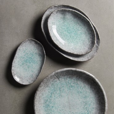 The Large Oval Plate features the dynamic Aqua Splash Glaze. It is a statement piece for your tableware collection. Measuring 30 cm in length, this plate combines functionality with artistic flair. Its design makes for a vibrant backdrop for serving mains, platters, or shared dishes.