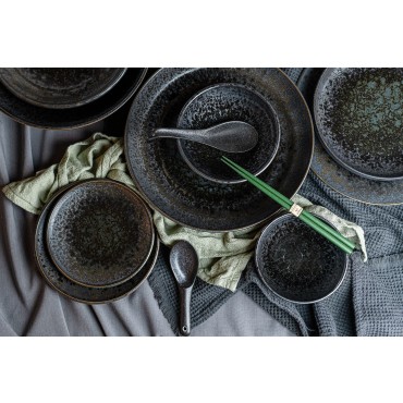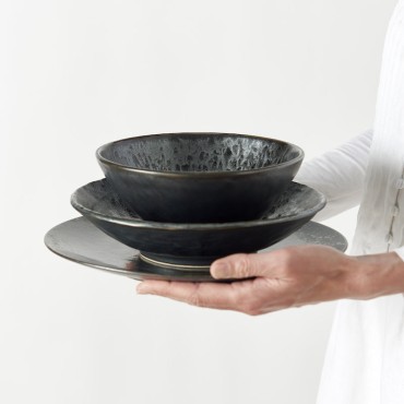 The Black Pearl Glaze is glossy black with soft charcoal speckles and natural variations in tone. The finish has a smooth, reflective surface with subtle shifts in depth.